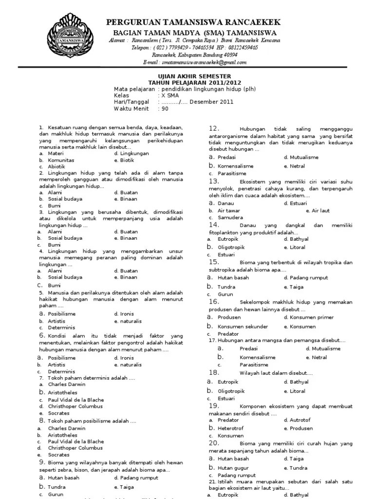 Berilah tanda silang (x) pada huruf a, b, c dan d pada jawaban yang . Ekosistem adalah kesatuan (hubungan timbal balik) antara makhluk hidup dengan lingkungannya yang saling mempengaruhi. Soal & kunci jawaban kimia semester 2 kelas 11deskripsi lengkap . Soal ukk plh kelas 3. Sekolah dasar negeri bojong 03 ulangan akhir semester sekolah dasar.